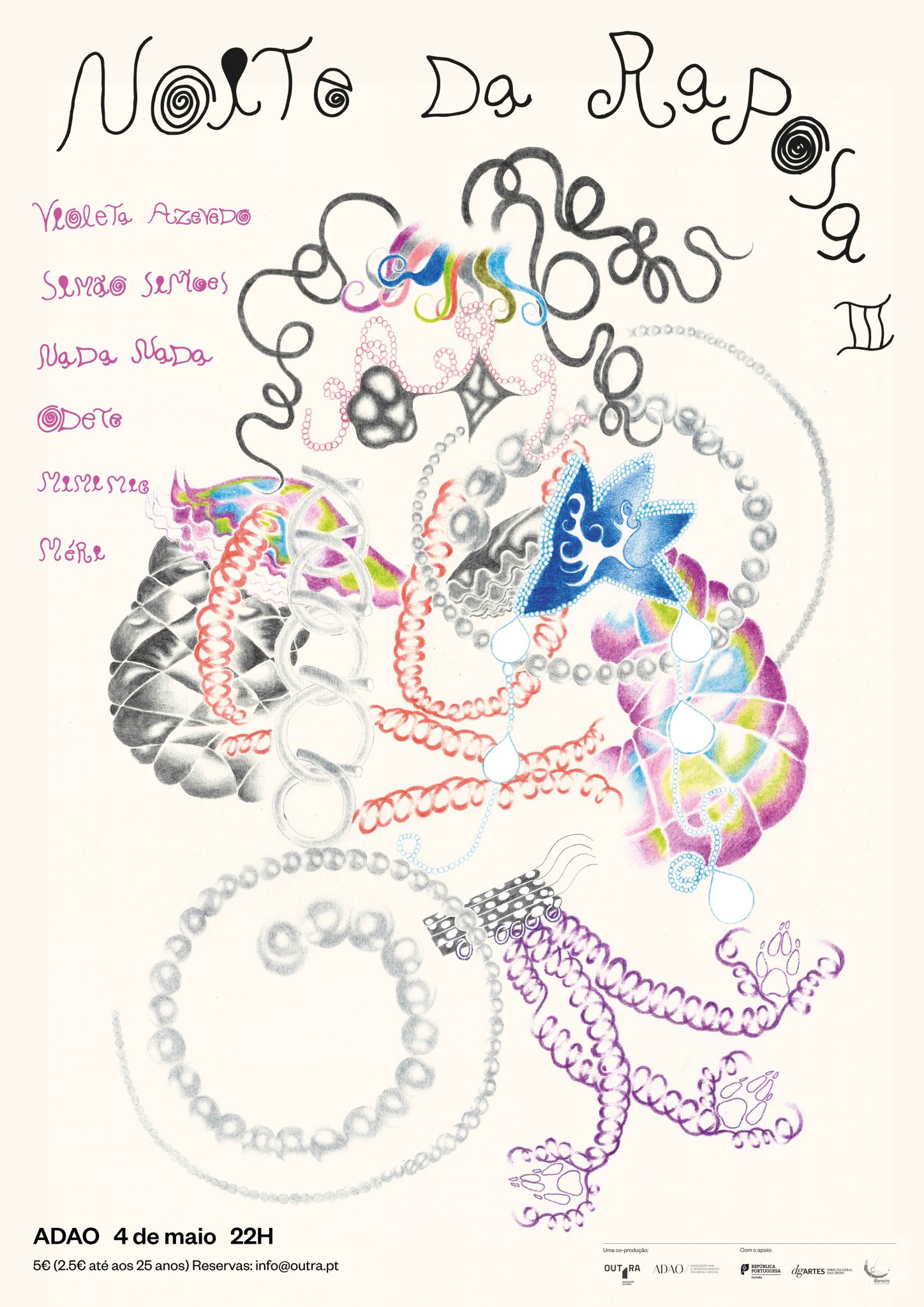 MIMIMIC is Diogo Carneiro's alias, exploring colorful psychedelic electronics; VIOLETA AZEVEDO is a huge Lisboan talent creating impossible soundworlds with a flute and fx processing; MÉRI is a member of the youth armada from Barreiro called Linha Amarela, good people with impeccable taste and pose; ODETE is one of the most active and activist voices in the country's heterogeneous dance music scene, returning to Barreiro after playing at OUT.FEST 2018; SIMÃO SIMÕES is a main figure in the new generation championing oblique electronics centered around the Rotten/Fresh label; NADA-NADA is multi-talented Cláudio Fernandes (Pista, Debut, etc) vehicle for making music that matches hawaiian shirts in the new millenium.