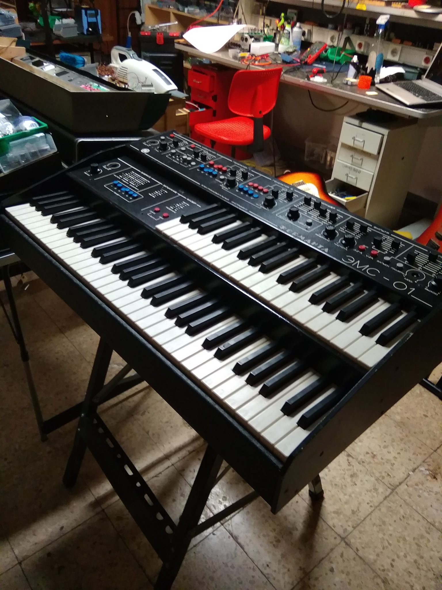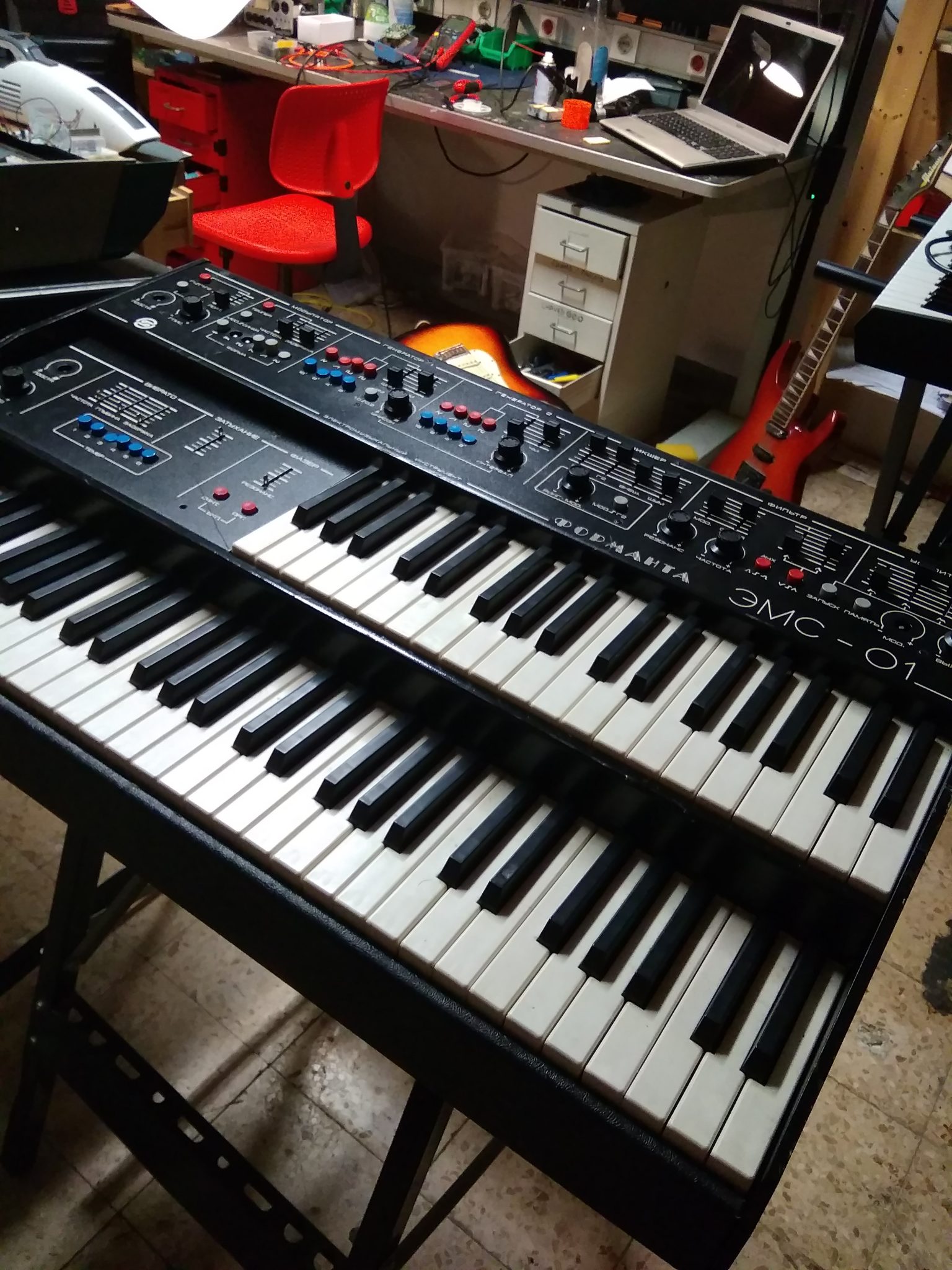 Estivemos a arranjar um synth que compramos, um synth russo que era usado para filmes e que é o melhor synth que eu experimentei até hoje, é incrivel, chamado Formanta EMS 01. É um sintetizador grande, com um teclado de orgão em baixo e em cima uma parte de synth mono, com um filtro parecido com o do Polivoks mas melhor, pode fazer sons parecidos mas também faz mil outras coisas. Foi um amigo nosso que já nos tinha arranjado um Polivoks que nos perguntou se queriamos este quando o encontrou – vinha estragado, como costuma ser o caso, mas tratamos disso. Mas adoro todos os synths analógicos, cada um tem o seu interesse.