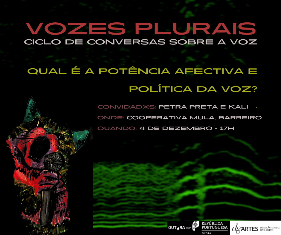“Vozes Plurais” é um ciclo de conversas abertas ao público sobre a potência afetiva e política da voz nas suas várias manifestações, seja na música, na oralidade ou na escrita. As pessoas convidadas para este primeiro encontro são a Sara Graça (Petra Preta) e o Kali (Passaru Macaco). Apresentando também as suas almas hyper-criativas, iremos estar à conversa sobre a presença e influência da voz nos nossos corpos. Como é que a voz é importante nas nossas vidas? Existe uma cisão entre o corpo e a voz? Que informação é que a voz consegue deixar registada? Vamos conhecer a voz destxs artistas e como ela ganha forma através dos desenhos, da escrita, dos experimentos musicais ou da distorção da própria voz. Também haverá momentos de visualização e escuta, para assistir a fragmentos de obras que nos ajudem a conversar sobre como a cultura molda a nossa voz e como a nossa voz pode também modificar essa cultura. Desde “Her” do Spike Jonze ao jogo “Nier: Automata” passando pela música de Pablo Vittar ou Laurie Anderson.