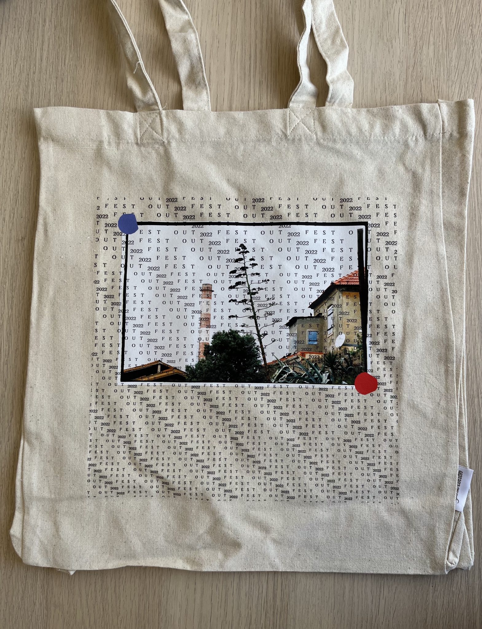 Tote bag do OUT.FEST 2022 em pano cru. Design: José Mendes. Fotografia: Vítor Lopes